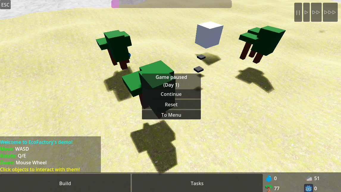 Finally, a chat-like textbox has been added to the UI which for now only displays the controls. You can also now reset the game, pause or go back to the main menu with the top-left button or by pressing ESC, which will not just automatically close the game anymore.